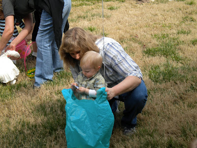Grams' work hosted an Easter egg hunt for the kids and grandkids of the employees this morning. It was my first experience participating in such an event. Lots of familiar faces were there: Aunt Rachel, Aunt Sarah, Dawson, Aunt Donna, Teagan and Kinsley, and of course Grams. It was lots of fun, but it was my nap time so I didn't have the energy to smile for any of the pictures. :)